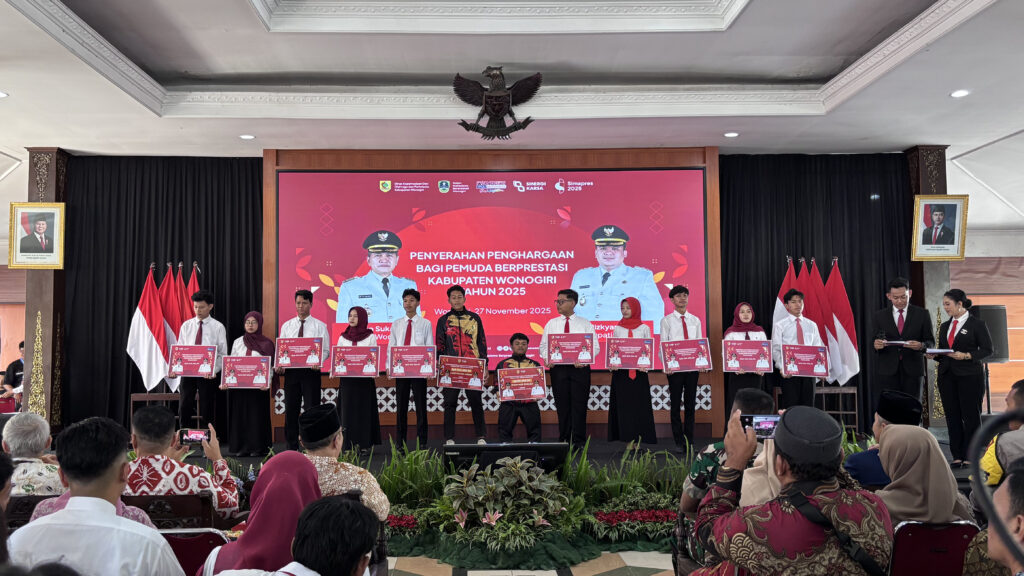 Wonogiri – Penghargaan bagi Pemuda Berprestasi Kabupaten Wonogiri Tahun 2025 telah diserahkan pada Kamis, 27 November 2025, di Pendopo Rumah Dinas Bupati Wonogiri. Kegiatan ini diselenggarakan sebagai bentuk apresiasi Pemerintah Kabupaten Wonogiri terhadap capaian akademik dan prestasi olahraga generasi muda daerah.